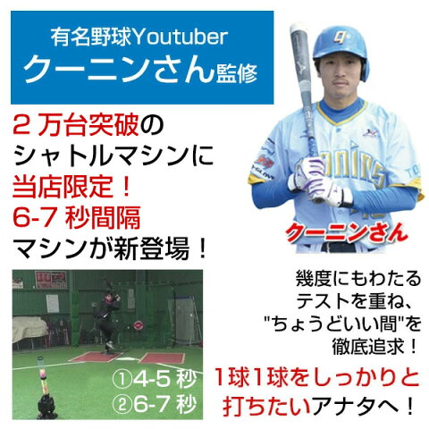 カテゴリトップ > 野球・ソフトボール > 野球特訓道場(野球練習用品) > カテゴリで選べる&探せる!野球練習グッズ一覧 > トス・ピッチングマシン ↓ラッピング(290円/税込)のご注文はコチラ↓ 【検索ワード:ラッピング 贈りもの 贈り物 贈物 贈答品 プレゼント ギフト お祝い 記念品 卒業 卒団】プレゼント交換 ギフトボックス】 商品説明 大人気のシャトルバッティング(直線軌道)マシンに、あの野球Youtuberクーニンさん監修の6-7秒間隔マシンが加わり、4-5秒間隔と6-7秒間隔で発射間隔が選べるようになりました! ・ドンドン打ちたい方=4-5秒間隔 ・しっかり間を取りたい方=6-7秒間隔※NEW で、練習のスタイルに合わせてお選び頂けます! パートナー不要でシャトル打ち! 段階別で角度・高さが調整できるので、幅広い年代のプレーヤーがお使いいただけます。